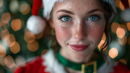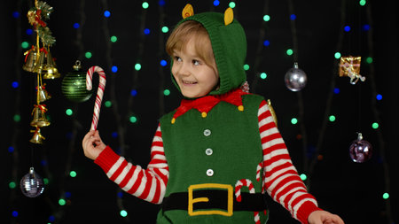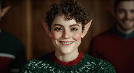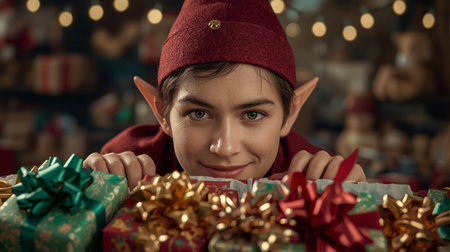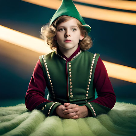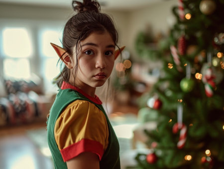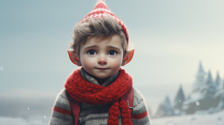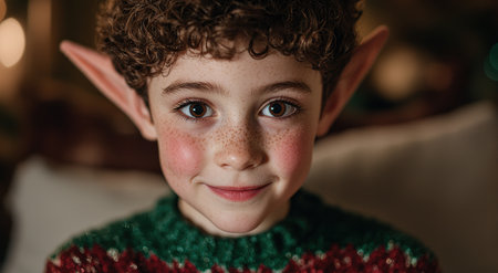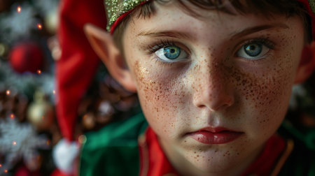 Smiling child dressed as a festive elf against a bright background showcasing holiday joy and cheerfulness