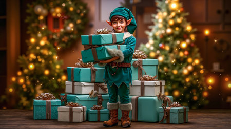 A young girl dressed as an elf is holding a stack of teal-colored gift boxes