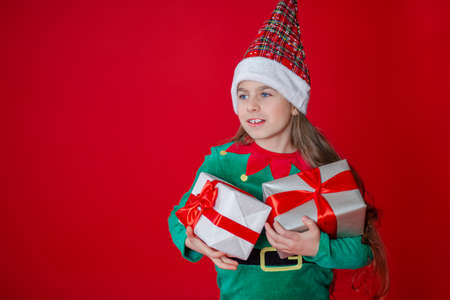 Portrait beautiful elven baby. Elf girl with gifts, Santa Claus helper on a bright red bright colored background. copyspace.