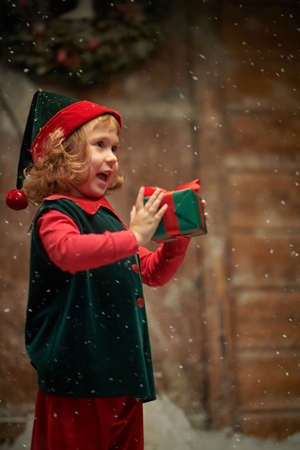 Christmas tale. A portrait of a little elf girl with cute curly hair, who stands by a wooden hut under a snowfall, holds a gift in her hands and laughs.