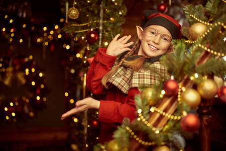 Christmas tale. A funny and cheerful girl elf stands in a fabulous Christmas setting and laughs. Magic lights flickering around.