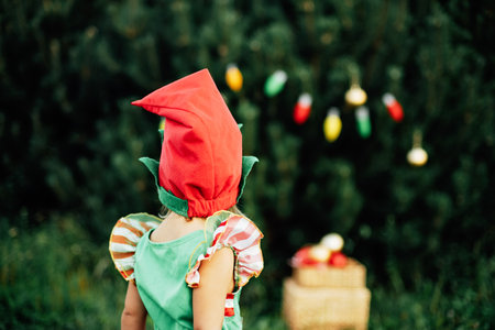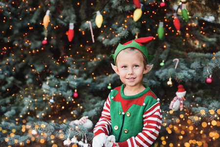 Christmas in july. children elf ears. Child waiting for Christmas in wood in july. portrait of little girl decorating christmas tree. winter holidays and people concept. Happy Holidays.