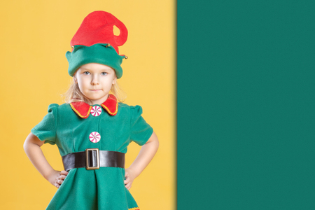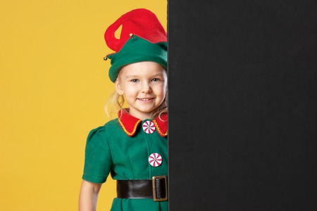 Little girl in a Christmas elf costume on a yellow background. A child is standing next to a place for text, copy space. Blank black background.