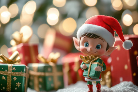 Funny photorealistic elf with soft bokeh and large blank area for message.