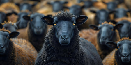 Closeup of one black sheep among a flock of white sheep symbolizing uniqueness and standing out from the crowd. Concept Black Sheep Symbolism, Uniqueness, Standing Out, Flock of Sheep