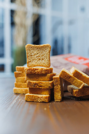 Dietary rusks bread. Crusty biscuits on kitchen table.