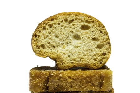 A closeup view of dry bread slices under the lights isolated on a grey background.