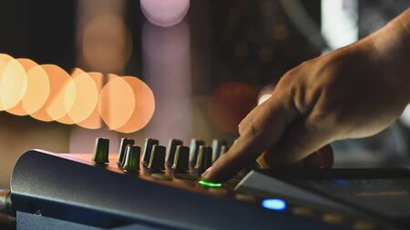 Close up of DJ mixing console in party light