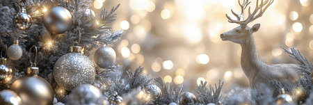 A white reindeer stands amidst shimmering gold and silver ornaments with sparkling lights in the background, creating a warm and festive atmosphere perfect for the holiday season.