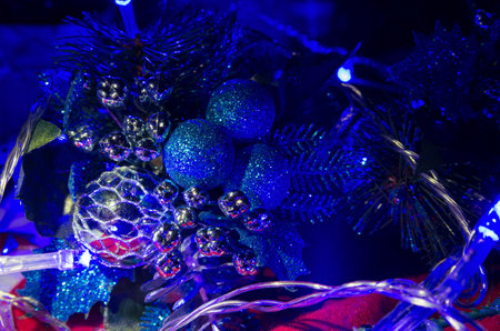 New year and blue xmas tree decorations with red ball and bauble, close-up