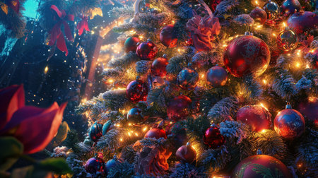 Christmas tree with stunning close-up details of ornaments, shimmering lights, and garlands. A festive New Year card design.
