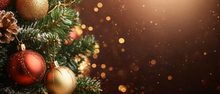 Christmas tree with bokeh and red ribbon, balls and glitter gold confetti, with copy space. Xmas present, Christmas banner, Horizontal christmas poster, greeting cards, headers, website.
