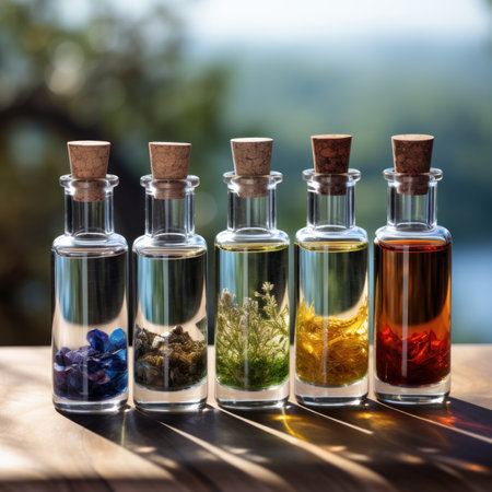 Set of five glass bottles containing various dried medicinal herbs against a dark background