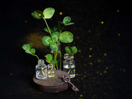 Four leaf clovers on black background with gold glitter and shiny bokeh, closeup with space for text. Design for your ad, poster, banner. Beautiful st patrick's day concept