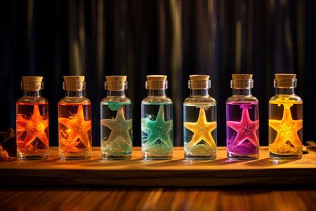 Seaside Serenity: Vibrant Aroma Oils, Candles, and Starfishes Adorned in a Mesmerizing Row of Six Bottles