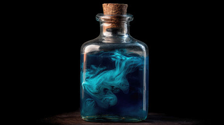 A captivating glass bottle filled with a mysterious blue liquid, showcasing swirling smoke-like patterns. Ideal for creative projects and artistic concepts.