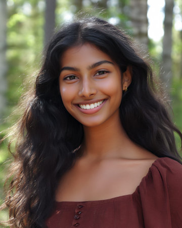 A close up portrait of a smiling Indian woman with a pretty face, looking directly at the camera.Image highlights her warm expression and natural beauty, capturing an engaging and friendly moment.