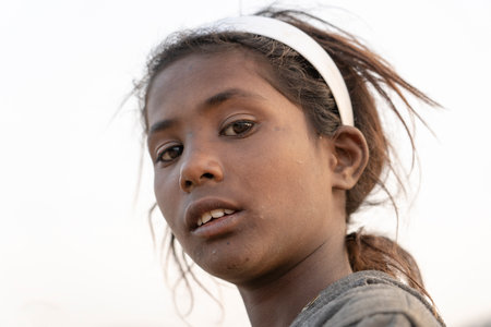 PUSHKAR, INDIA - NOVEMBER 14, 2018: Indian young girl in the desert Thar on time Pushkar Camel Mela near holy city Pushkar, Rajasthan, India, close up portrait