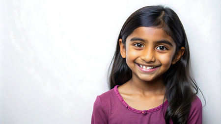 A cheerful, young Hindu girl, smiling happily in front of a plain pastel background, captured in a commercial style, showcasing innocence and joy, great for advertising campaigns