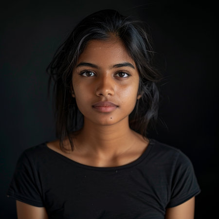 Portrait of a young woman with a thoughtful expression against a dark background