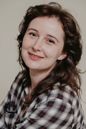 Attractive girl with natural imperfections in a stylish plaid shirt on a gray background