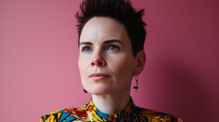 a woman with short hair wearing a colorful shirt
