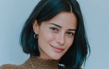 Portrait of pretty woman dark hair, blue eyes