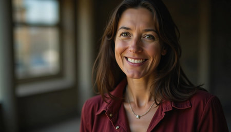 In a softly lit room, a cheerful woman exudes positivity with her radiant smile. Her casual attire and relaxed demeanor create a friendly atmosphere, perfect for connection.