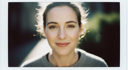 Cheerful Woman Portraits Smiling with Gentle Eyes Against Foliage Backdrop, Radiant and Happy Face