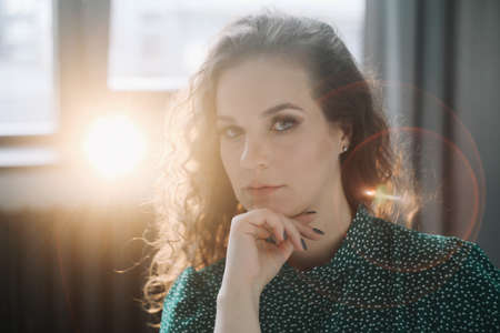 Portrait of a young beautiful woman with curly hair in the room.