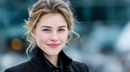 A young woman with blonde hair smiles warmly while wearing a black coat in a snowy outdoor environment.