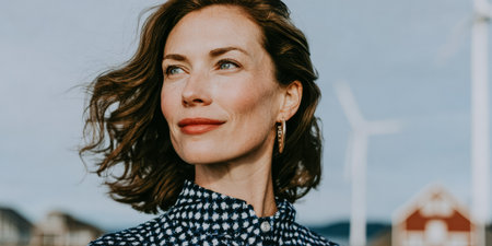 A woman stands outside with her hair moving in the wind. She looks towards the horizon. Wind turbines and buildings are seen in the background. The sky is clear.