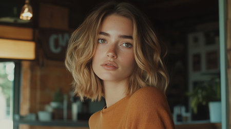 Young woman with wavy hair in a cozy cafe setting during the afternoon