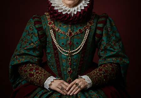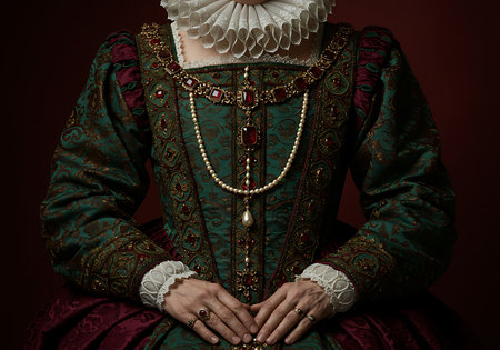 regal Elizabethan woman adorned in intricately embroidered gown Her dramatic expression conveys intrigue while holding delicate silk handkerchief