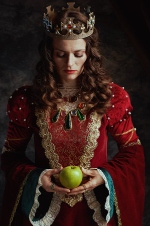 medieval queen in red dress with green apple and crown on dark gray background.