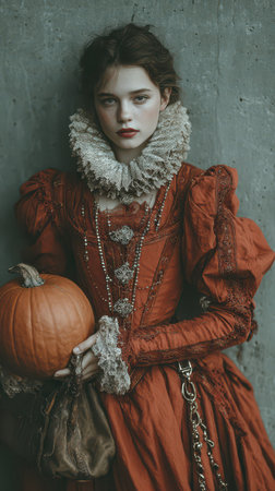 A young woman in rich vintage clothing stands against a textured wall. She holds a bright orange pumpkin and exudes a mysterious charm.