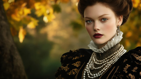 A captivating portrait of a woman in vintage attire adorned with elegant jewelry, set against a soft autumn backdrop. Rich colors and serene expressions enhance the scene.