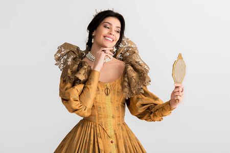 smiling queen with crown looking at mirror isolated on grey
