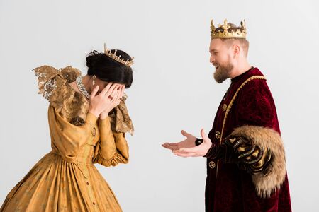 queen and king with crowns quarreling isolated on grey