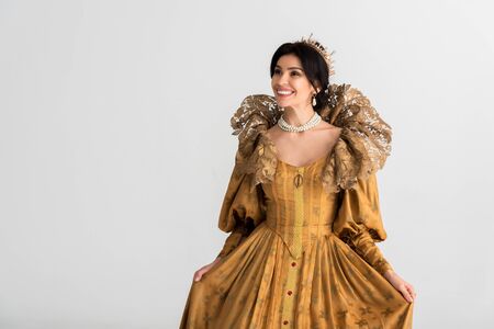 smiling queen with crown looking away isolated on grey
