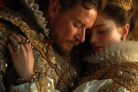 Capturing passion in the renaissance, Victorian, and baroque era: a timeless love story portrayed by a couple in vintage attire, embracing the elegance, romance, and nostalgia of historical periods
