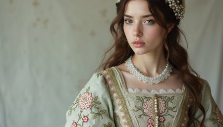 A stunning young woman with long, wavy hair gazes thoughtfully at the camera, adorned in a beautifully embroidered vintage dress. Her delicate pearl accessories and soft expression evoke a sense of timeless beauty and grace, capturing the essence of classic elegance.