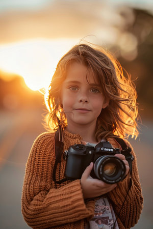 Child with camera, golden hour in savannah, hopeful gaze, storytelling close-up