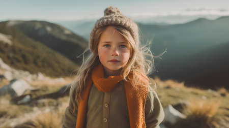 Portrait of a cute little girl in a knitted hat and sweater on the background of mountains