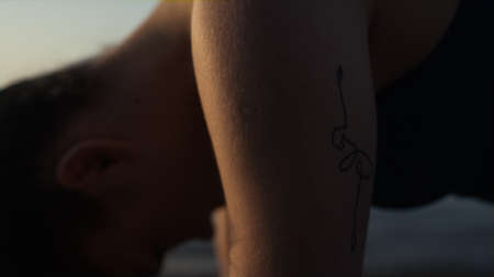 Closeup tattooed girl making worm-up in front calm ocean. Athlete woman training yoga exercises on soft sunlight outdoors. Unknown fit sportswoman stretching neck wearing dark sportswear summer day.