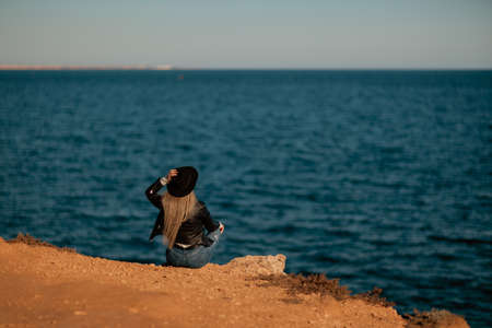 A serious blonde girl in a stylish black leather jacket and a black hat is sitting with her back to the seashore