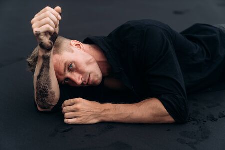 Portrait of handsome blue-eyed man in black shirt lying on black sand beach