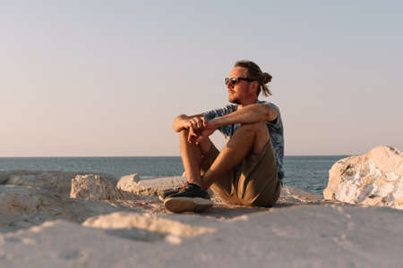 Handsome guy sitting on the sand on the beach and looking out into the distance on the sea
