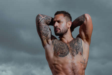 Sexy man with naked torso. Portrait of handsome man with serious face. Strong muscular male body, muscles guy. Naked male shoulders, topless athletic body.