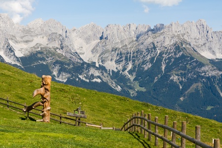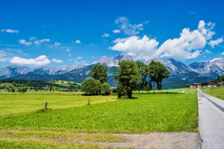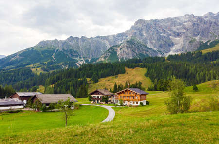 A beautiful view of the austrian alps with typical mountain houses, Austria